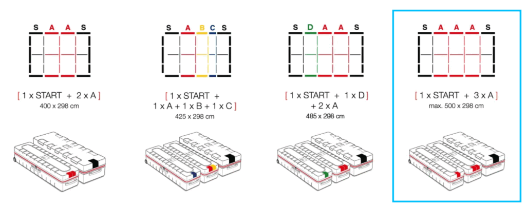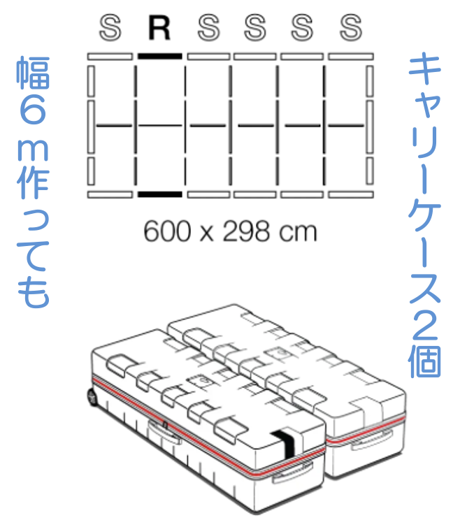 REAL-BIG LEDUPというタイプの型番(R-585/600等)があります。このREALというタイプは最大w10.0mまでの大型壁面を目的としたもので、w5.5m~6.0mまでなら専用ケースが2個でOKです。Rが付かないBIG LEDUPのW5.0mではケースが3つ必要でした。注意点としてはR- が付く型番を購入した場合、w3.0m が最小サイズとなり通常のスターターと呼ばれるw2.0mでは使えないことです。
