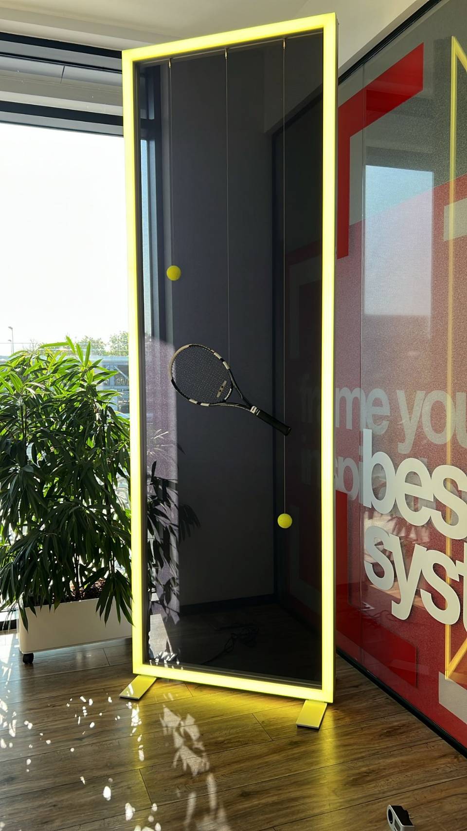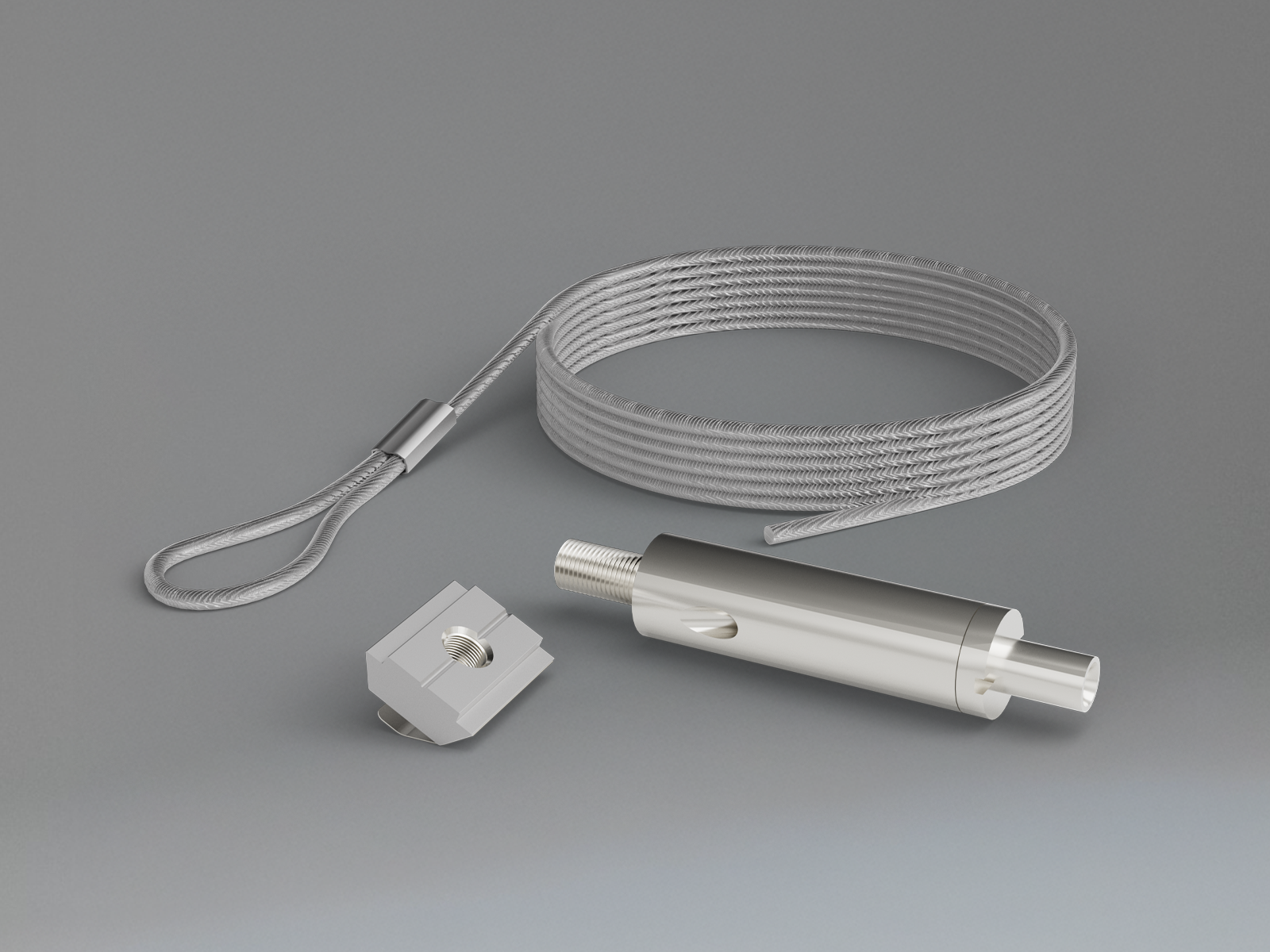 M5ネジと溝付きセクションにより、工具不要でLINEUPフレームプロファイルに簡単に取り付け可能です。全長300cm、ロープ径1.5mmの仕様で、十分な吊り下げ柔軟性を確保しつつ、控えめな視覚的印象を維持します。