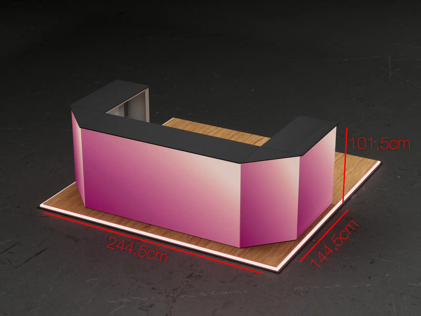 COUNTER CARMEN Setは、プレミアムなC字型LEDカウンター構成です。オープン相談エリア、製品展示、受付スペースに最適で、滑らかなコーナー移行と連続したイルミネーションフロントを備えた360°プレゼンテーション面を提供します。