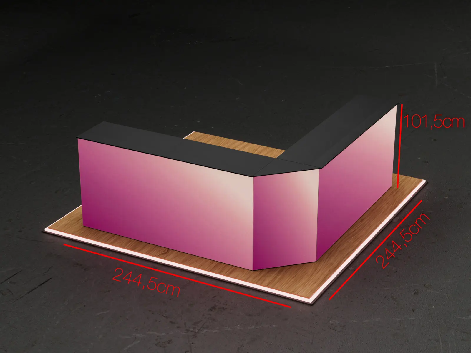 COUNTER LOLA Setは、広々としたインパクトのあるL字型カウンター構成を実現し、コーナーブース、オープンな受付エリア、多角的な商品展示に最適です。4台のカウンターワンユニット、シームレスな前面ファブリック用ダブルエクステンションセット、90°のクリーンな接続を実現するコーナーコネクターが含まれます。