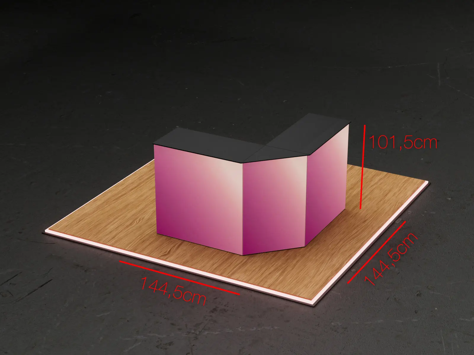 COUNTER LUCIA Setは、2台の照明付きカウンターワンユニットとコーナー拡張ユニットを組み合わせ、洗練されたコーナーカウンターレイアウトを実現します。90度の角度が開放感と親しみやすさを生み出し、デザイン性と視認性が求められる相談窓口、インフォメーションポイント、プロモーション用途に最適です。